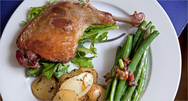 Конфи - визитная карточка французской кухни, родившаяся в провинциях и триумфально вошедшая в лучшие рестораны Парижа. Традиционно конфи делают из гусиного или утиного мяса, свинины или индейки, но самое популярное конфи - утиное. Откровенно говоря, за красивым слово конфи скрывается немного-немало всем знакомая тушенка, а конфи - не столько собственно блюдо, сколько способ консервирования мяса или птицы на довольно долгое время. Для приготовления утиного конфи берут утиные ножки и утиный жир - его можно вытопить из жирной утиной кожи на сковороде. Утиные ножки натирают крупной солью и оставляют на ночь охлаждаться в холодильной камере. Затем кладут ножки в сковороду и заливают вытопленным жиром так, чтобы он полностью покрывал утку. Закрывают сковороду крышкой и тушат на медленном огне в течение двух часов. Для большего аромата в жир добавляют чесночную стружку и тимьян. Когда мясо свободно отделяется от кости, а кожица становится хрустящей и золотистой, но не сухой, конфи готово и его можно перелить в небольшие порционные горшочки, вновь залив утиным жиром: таким образом конфи может храниться в сухом прохладном месте длительное время. Подают к конфи зеленые салатные миксы или картофель, обжаренный в том же жире.